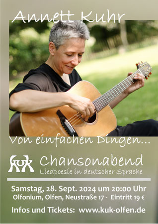 Die Liedermacherin mit der tiefen,warmen Stimme begleitet sich selbst meist mit filigranem Gitarrenspiel und bisweilen auch auf dem Klavier. Auch als Musikerin geht Annett Kuhr eigene Wege, nimmt Anleihen bei Klassik, Folk und Jazz, ohne sich jemals festzulegen.